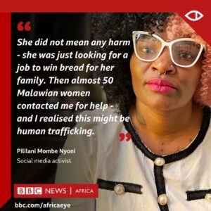 "Ella no quería hacer daño a nadie - estaba sólo buscando un trabajo para ganar el pan para su familia. Después, casi 50 mujeres malauíes me contactaron por ayuda - y me di cuenta que esto podía ser tráfico humano" - Pililani Momee Nyoni, activista en redes sociales. Ella también es parte de la red de ayuda, y participa del documental "Trapped in Oman". Fuente: bbc.com/africaeye