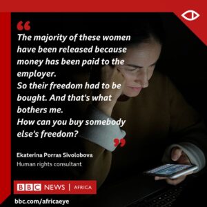 "La mayoría de estas mujeres fueron liberadas porque se les pagó a los empleadores. Por lo tanto, su libertad fue comprada. Y eso es lo que me molesta. Cómo es posible comprar la libertad de alguien" - Ekaterina. Fuente: bbc.com/africaeye