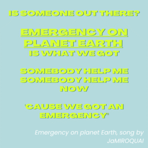 "Hay alguien allá afuera? Tenemos una emergencia en el planeta Tierra, alguien que me ayude!" - Letra de Emergency on Planet Earth de Jamiroquay