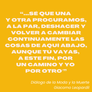 Algo de esto ya estaba, de manera brillante, en Leopardi. En su Diálogo de la Moda y la Muerte, imaginó a ambas como hermanas. No era solo una provocación literaria: entendía que la moda, bajo su aparente frivolidad, participa de una lógica de desgaste, obediencia y descarte. La Muerte destruye de una vez; la Moda, en cambio, va erosionando más lentamente, ridiculizando lo que acaba de quedar viejo e imponiendo nuevas formas.