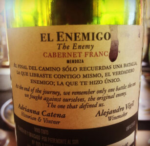 "Al final del camino, sólo recuerdas una batalla. La que libraste contigo mismo, el verdadero enemigo; la que te hizo único" - Etiqueta del vino El Enemigo